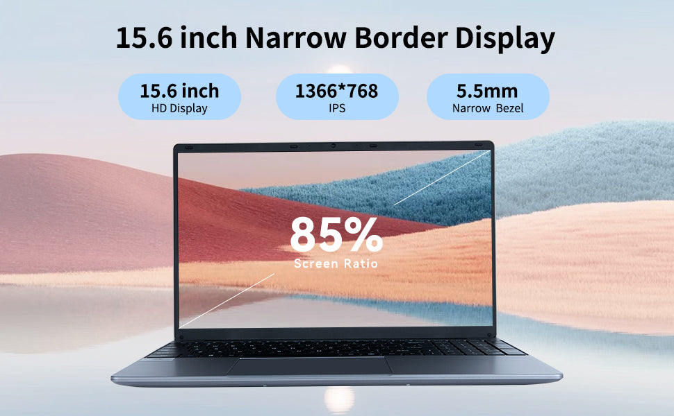 15.6-inch large IPS screen with 1366*768 pixels, 5.5mm narrow bezel, 16:9 ratio, and a screen-to-body ratio of up to 85%. AEEZO notebook laptop provides a clear and wide viewing screen, better visual perception and healthier eyes.