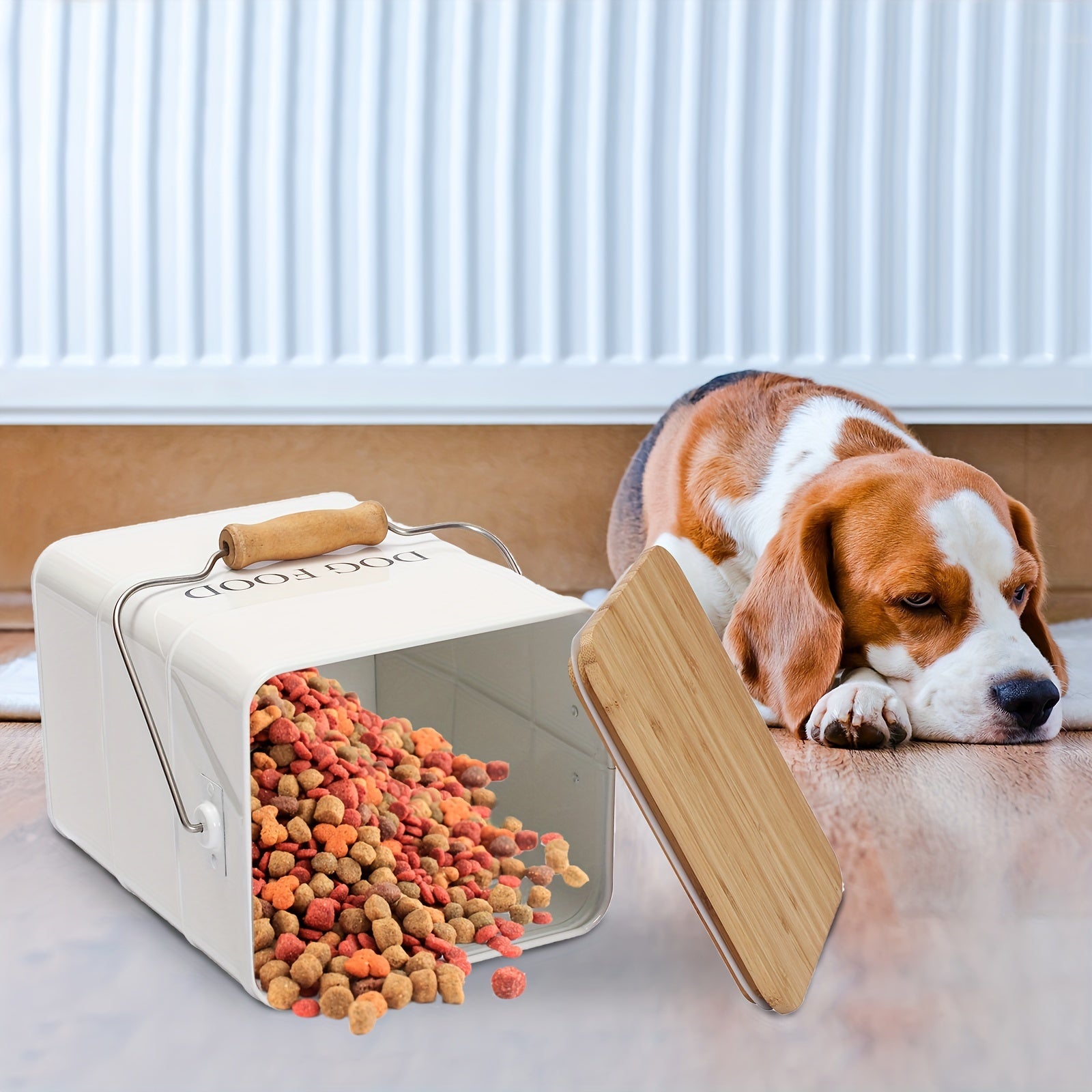 Rectangle Metal Dog Food Storage Container with Airtight Wooden Lid and Scoop - Durable Pet Food Bin with Wooden Handle, White Farmhouse Style Dog Food Box
